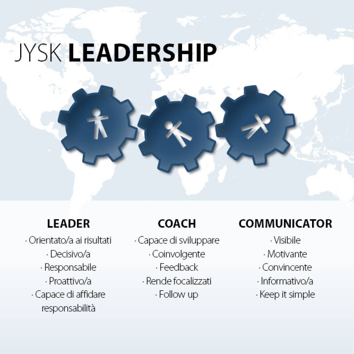 Oltre ai nostri valori fondamentali, ci aspettiamo che i nostri manager si comportino come leader, allenatori e comunicatori secondo la Leadership JYSK.