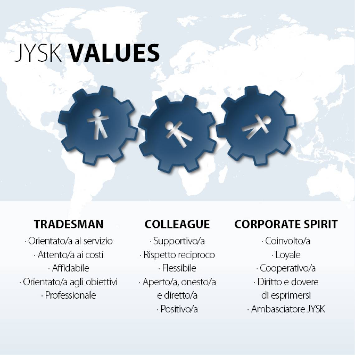 I tre pilastri dei valori JYSK - Tradesman, Colleague e Corporate Spirit - possono essere ricondotti al fondatore della nostra azienda Lars Larsen. Esprimono il comportamento e l'atteggiamento che possiamo aspettarci dagli altri.